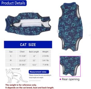 2. 【Size】: S: Weight 2-3.4 lb and Back Length 9″, M: Weight 3.4-7 lb and Back Length 11″, L: Weight 7-14 lb and Back Length 14″ for the cat onesie for cats after surgery