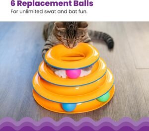 - Improved interactive cat toy with three-level ball track comes with six brightly colored spinning balls to bat, swat, and chase around the tracks