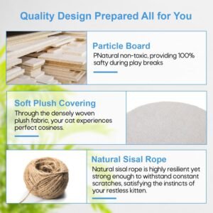 - 🐱 【Posts for Scratching Covered in Sisal 】These are scratching surfaces that are integrated into the framework. Cats love to bury their claws in sisal because it’s a sturdy substance with a coarse texture. Our cat tree promotes healthy scratching habits and helps discourage cats from damaging furniture by offering dedicated spaces for them to scratch.