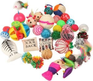 - Warm Reminder: This is a randomly assembled product bundle. We will periodically update the toys included, so the styles and colors of the toys may differ from the pictures. It contains 20 different toys, including Cat wand toy, cat ball toys, catnip mice, rattle toys, feather toys, and more.