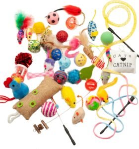 - Warm Reminder: This is a randomly assembled product bundle. We will periodically update the toys included, so the styles and colors of the toys may differ from the pictures. It contains 20 different toys, including Cat wand toy, cat ball toys, catnip mice, rattle toys, feather toys, and more.